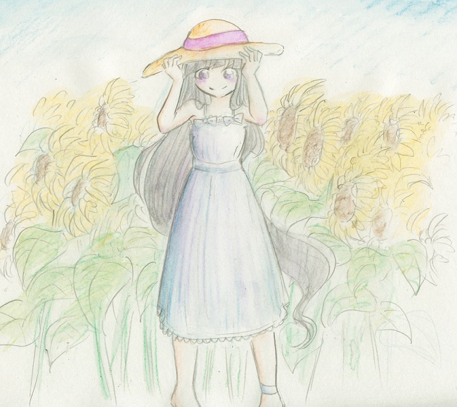 青い空とヒマワリ畑と麦わら帽子と白ワンピース。